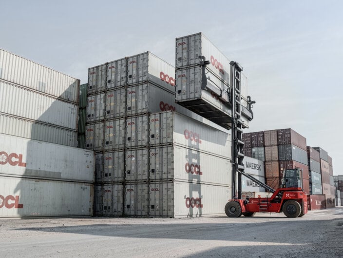 Our range of empty container handlers also known as container top loaders can be built to meet your exact needs. You can choose from a range of single container stackers with 8, 9, 10 and 11 tonnes lifting capacities and a range of stacking heights from 4 to 8-high. Double container stackers are also available with 10 and 11 tonnes lifting capacities, with stacking heights from 4+1 to 8+1-high. Plus, there is a wide selection of drive lines and performance levels that you can match to your individual container handling needs.