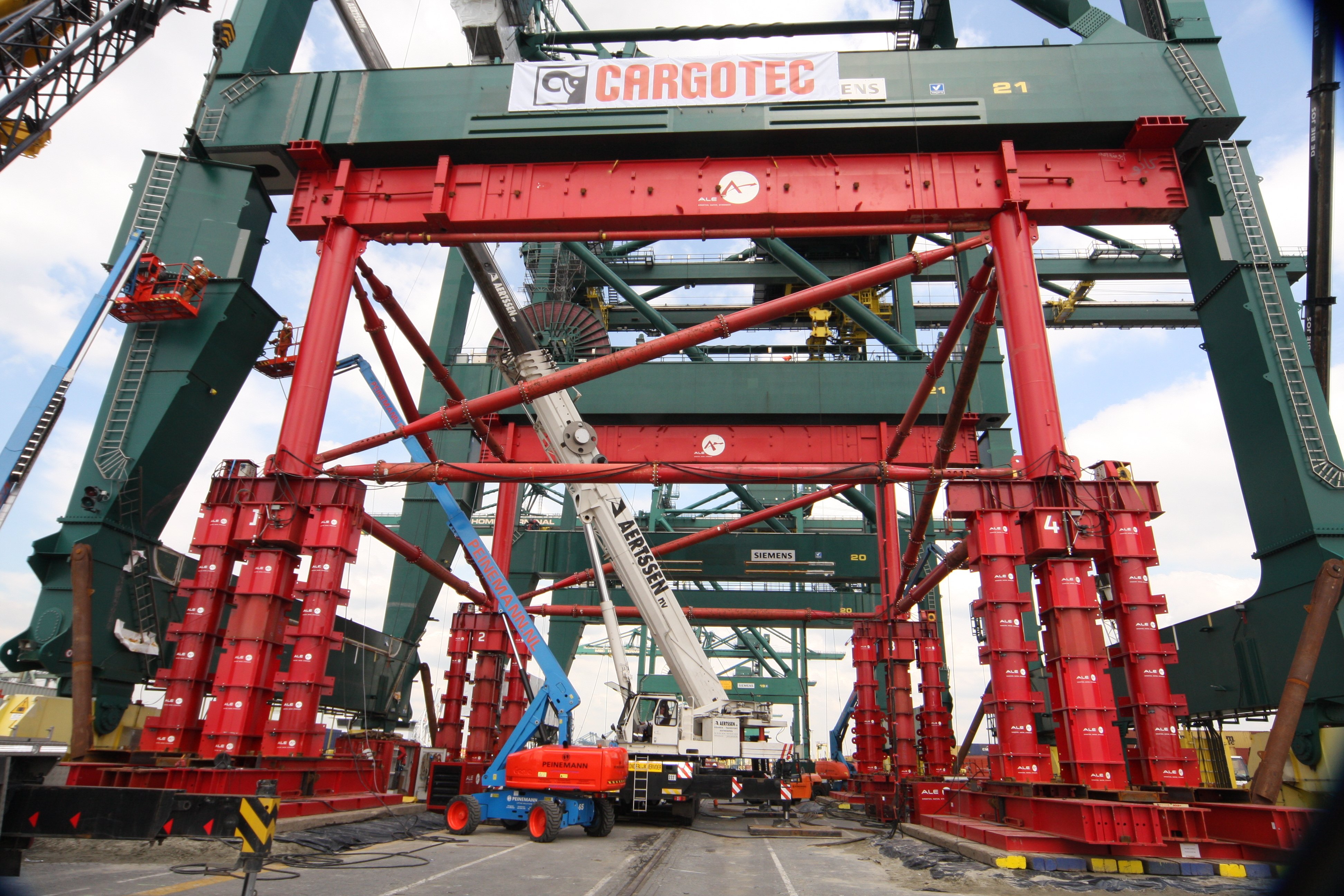 The highly specialised technique involves jacking the crane and inserting a heightening construction just below the gross girders. In order to maintain the rigidity or stiffness, the sill beam is strengthened and bracers are installed at the waterside portal frame. This process enables the crane height to be increased by four meters.