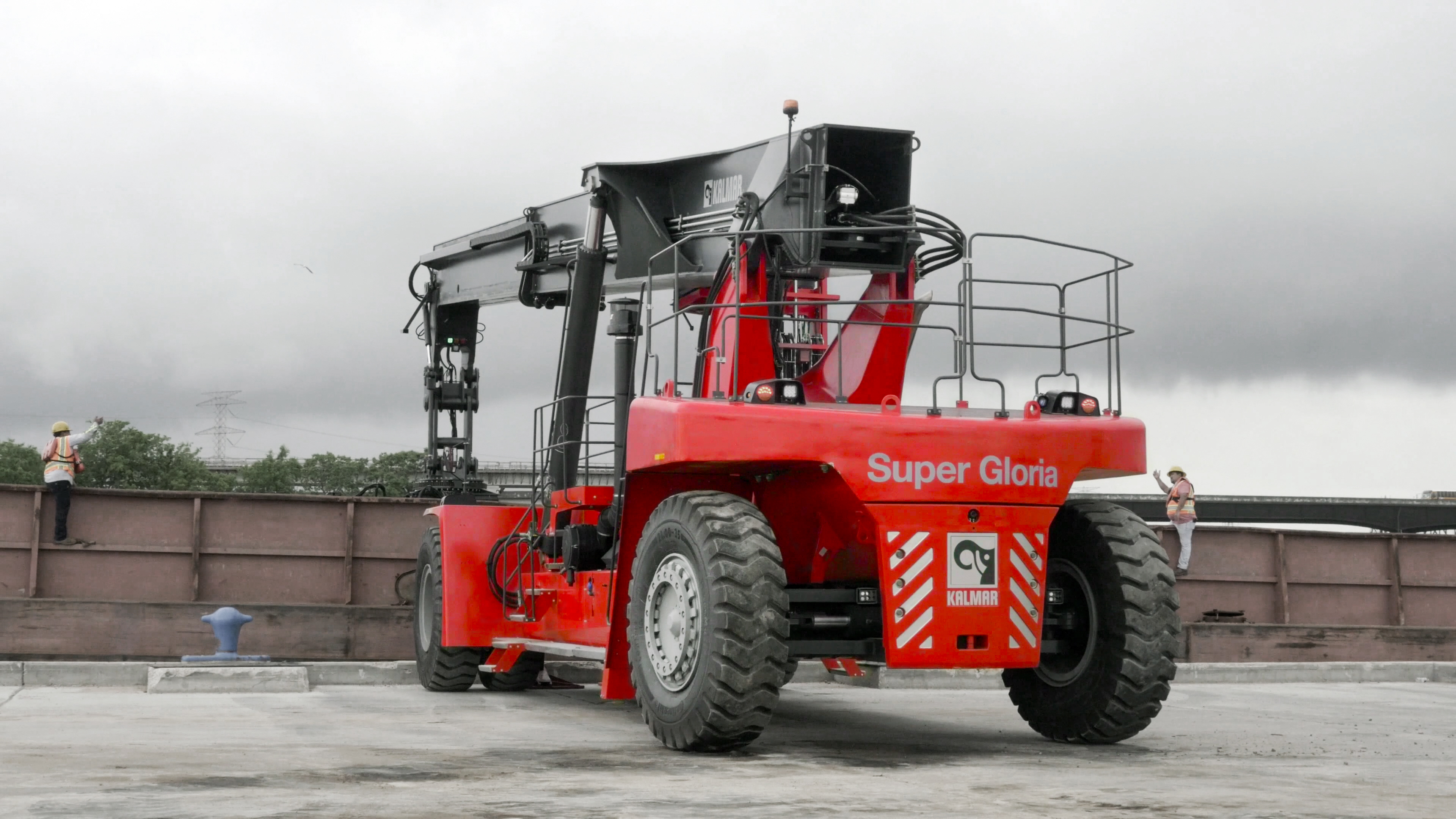This unique reachstacker is the first Kalmar Super Gloria that has been delivered to the Western Hemisphere. The unit can reach the fourth row in a barge, which is further than Kalmar's standard reachstacker, and lifts 45 metric tonnes. The Kalmar DRG450-92HCS5XS reachstacker has a long nose and over height legs for negative lift, and good capacity retention (27 metric tonnes in the fourth row with the support jacks down). The machine also features an elevating cabin to give visibility into the barge and a rear detection system and camera for maximum safety.
