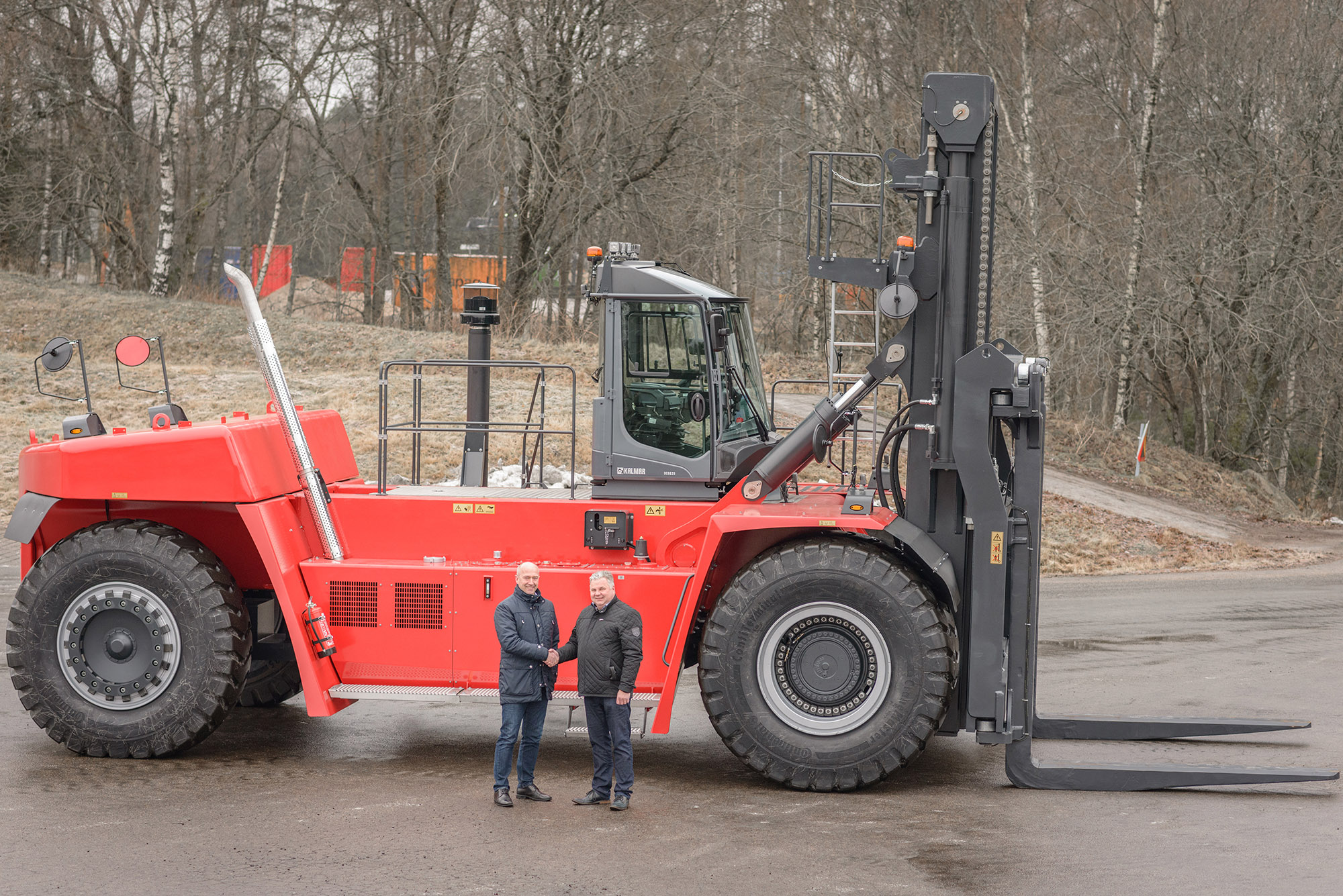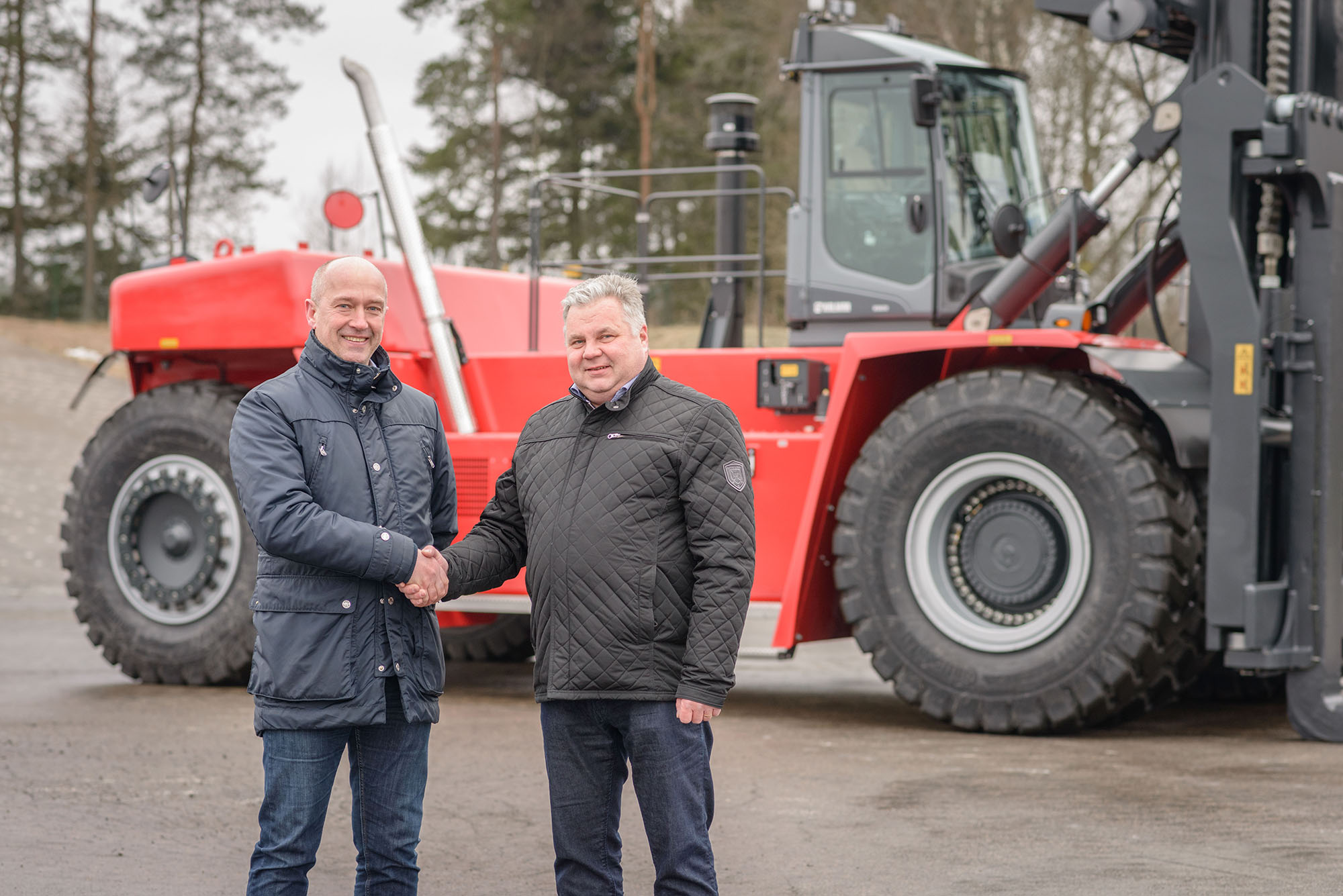 In the pictures: Thomas Malmborg, Vice President, Kalmar Forklift trucks and Pekka Sarajärvi, CEO, Pentti Hämeenaho Oy with the Kalmar super-heavy forklift truck.