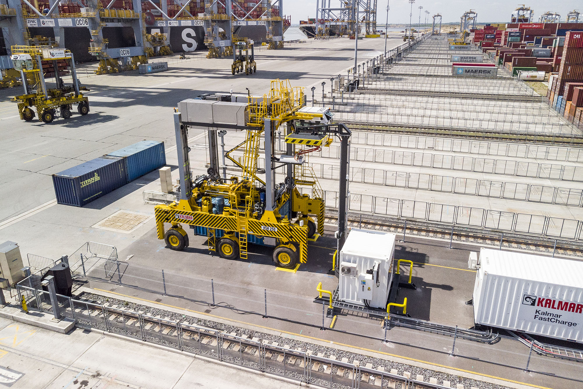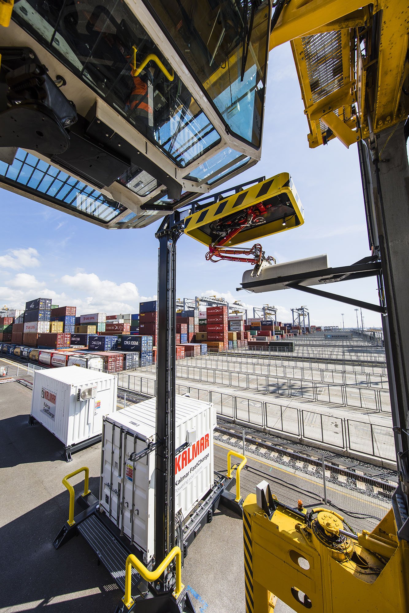 The project involved the conversion of one of the terminal's existing Kalmar hybrid shuttle carriers into an electrically powered FastCharge shuttle carrier. The modification work itself was completed in just a few weeks. Kalmar FastCharge is based on the same opportunity-charging technology used in electric buses, with charging taking place during the idle time in the shuttle carrier's working cycle. Onboard charging is supplemented by regenerative systems that store energy generated by braking and spreader-lowering operations.