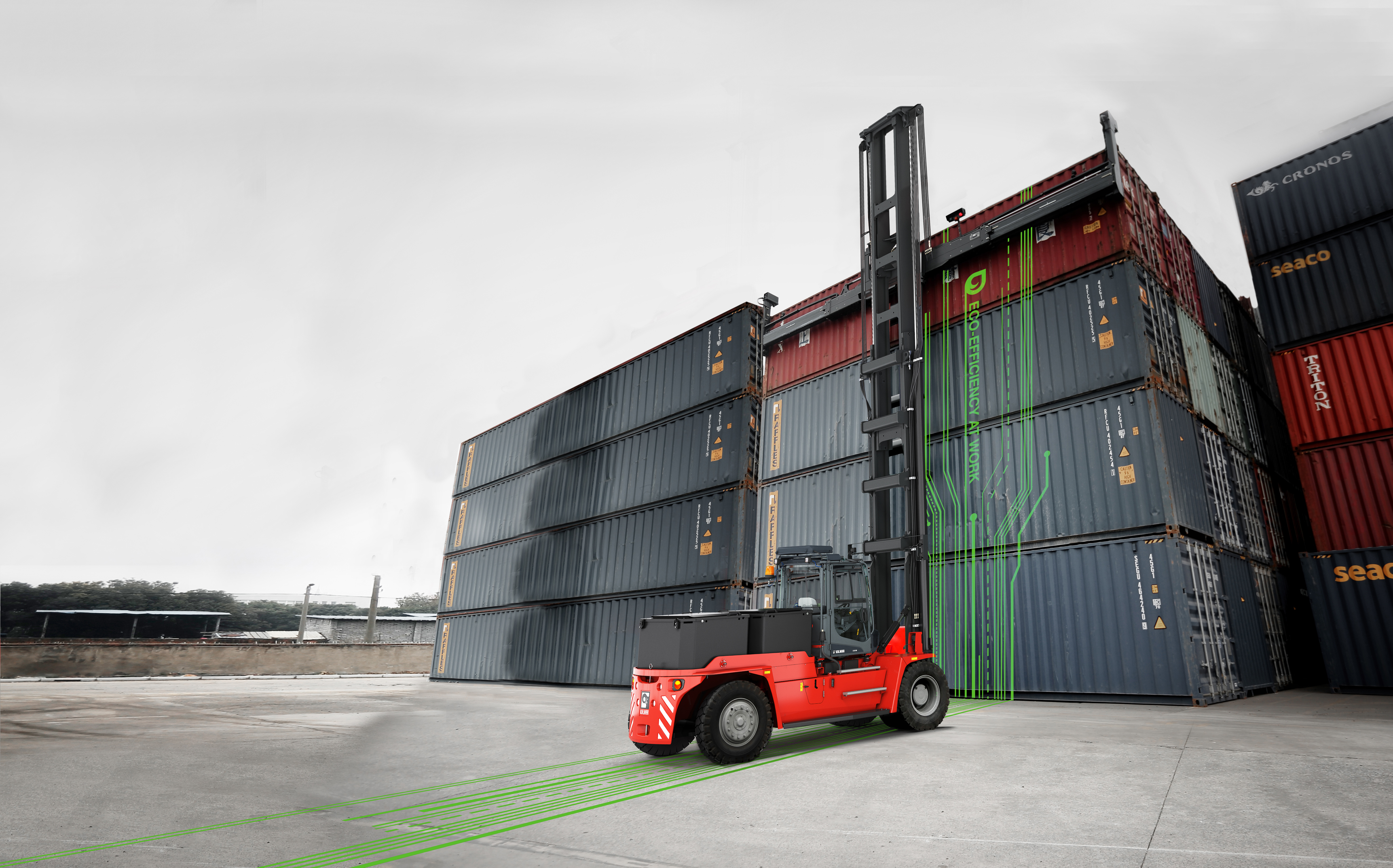 Based on the Kalmar ECG90-180 medium electric forklift, the new machine is designed to help customers reduce overall fuel costs and comply with increasingly strict airborne and noise emissions standards without compromising on performance. It can stack containers up to four high and is available with a choice of battery technologies to ensure a clean, efficient lift every time. With fewer moving parts and lower rates of wear and tear than a diesel-powered machine, the Kalmar Electric Empty Container Handler is also simpler and more cost-effective to maintain.