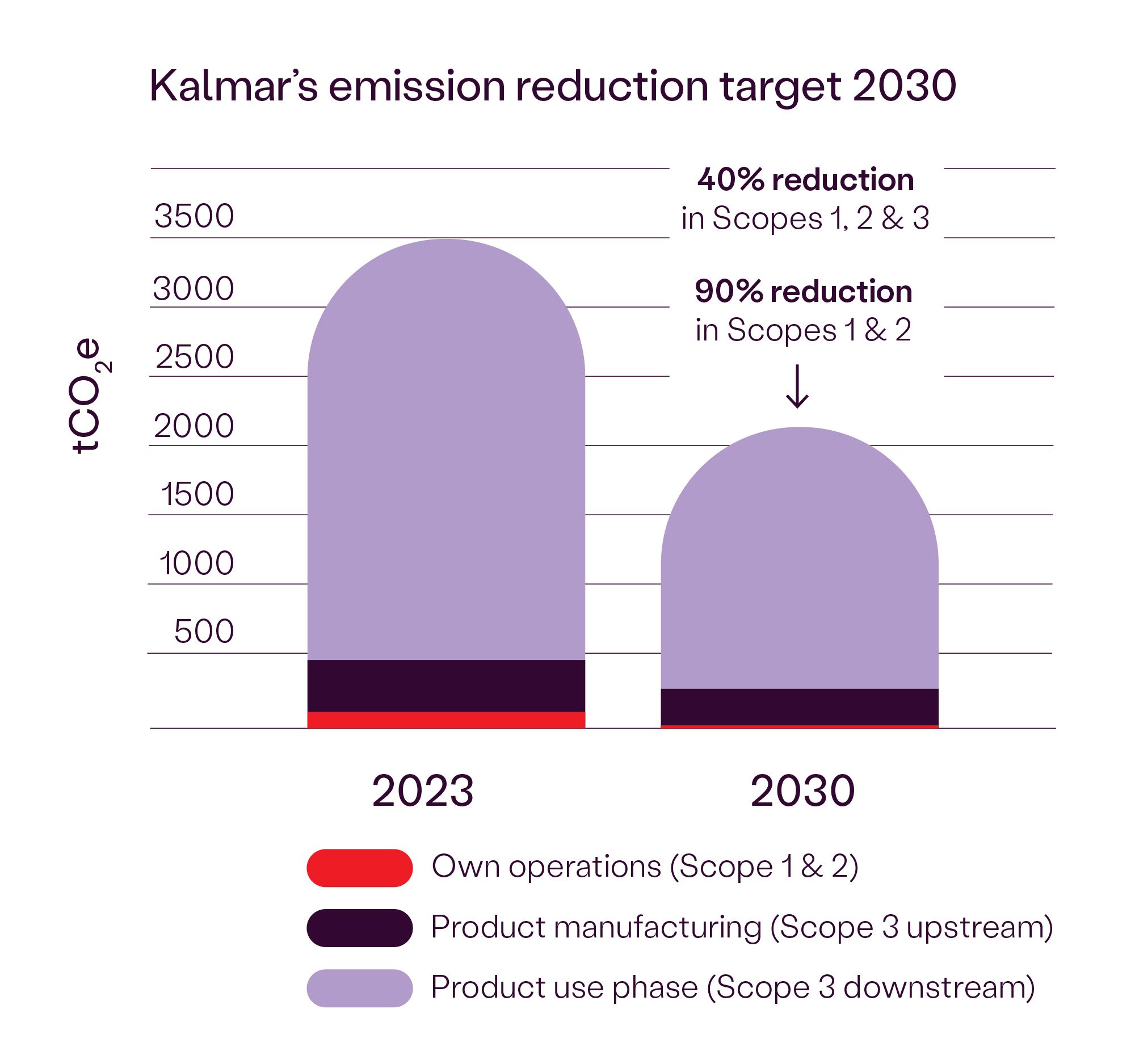 Kalmar has set near- and long-term emission reduction targets, supporting its long-term strategy and vision to be the forerunner in sustainable material handling equipment and services. The near-term target is to reduce scope 1 and 2 emissions by at least 90% and scope 3 emissions by at least 40% by 2030, with 2023 as the baseline year. The long-term target is to achieve net zero by 2045 in all scopes. With these targets, Kalmar aims to contribute to limiting the global temperature rise to 1.5°C.