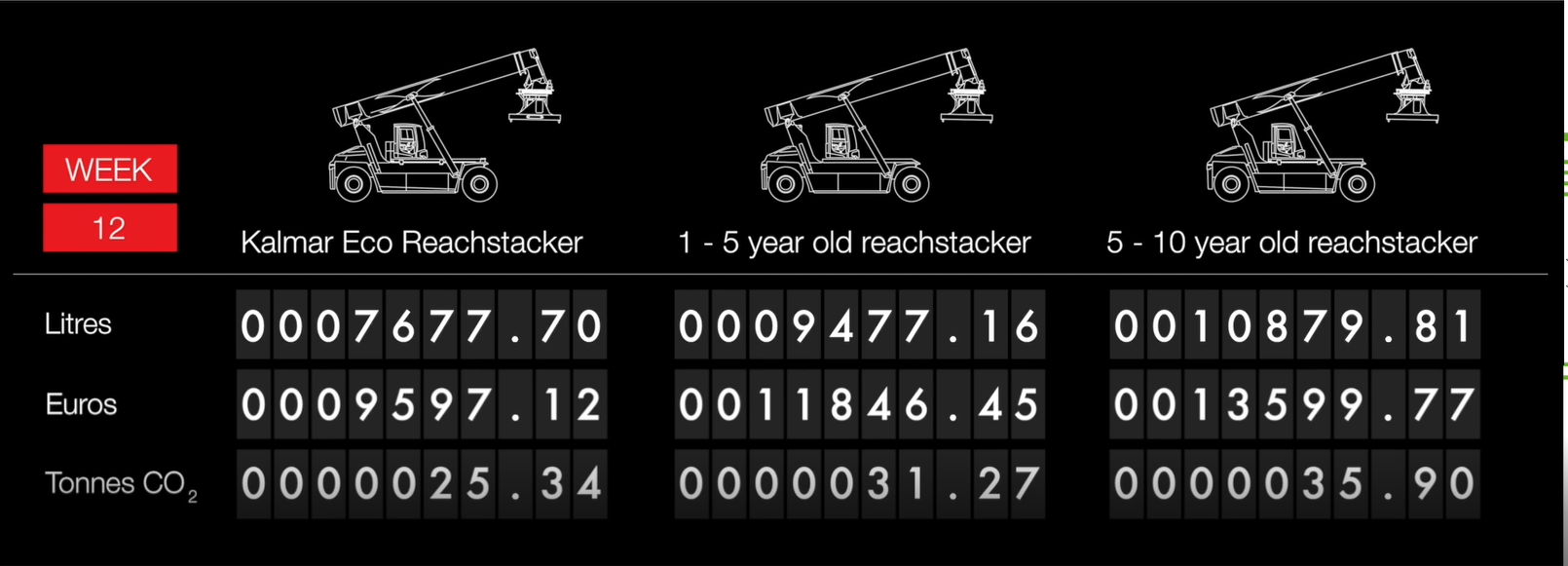 Polttoainekustannusten kasvu ja entistä tiukemmat päästönormit tarkoittavat että tarvitset kilpailukykyisemmän ja vihreämmän ratkaisun, joka silti säilyttää toiminnan tuottavuuden korkeimmalla tasolla. Kalmar Eco konttikurottaja on ekotehokas ratkaisu joka käyttää taatusti merkittävästi vähemmän polttoainetta kuin muut konttikurottajat. Vähennä kustannuksia ja päästöjä ja paranna samalla yrityksesi ympäristömainetta.