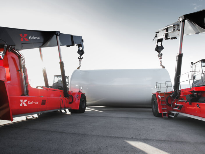 Kalmar-konttikurottajat ovat saavuttaneet kadehdittavan maineen tuulivoimateollisuuden raskaiden komponenttien, kuten napojen, lapojen, tornien ja konehuoneiden käsittelyssä. Nämä raskaat ja tilaa vievät osat ovat helppo nostaa, kun konttikurottajaan on asennettu jokin Kalmarin erikoislisälaitteista.