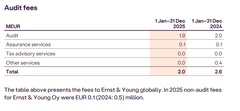 Kalmarin varsinainen yhtiökokous valitsi 31.3.2026 Kalmar Oyj:n tilintarkastajaksi hallituksen ehdotuksen mukaisesti tilintarkastusyhteisö Ernst & Young Oy:n, joka nimitti Kristina Sandinin päävastuulliseksi tilintarkastajaksi. Tilintarkastajien palkkiot maksetaan yhtiön hyväksymän laskun mukaan.